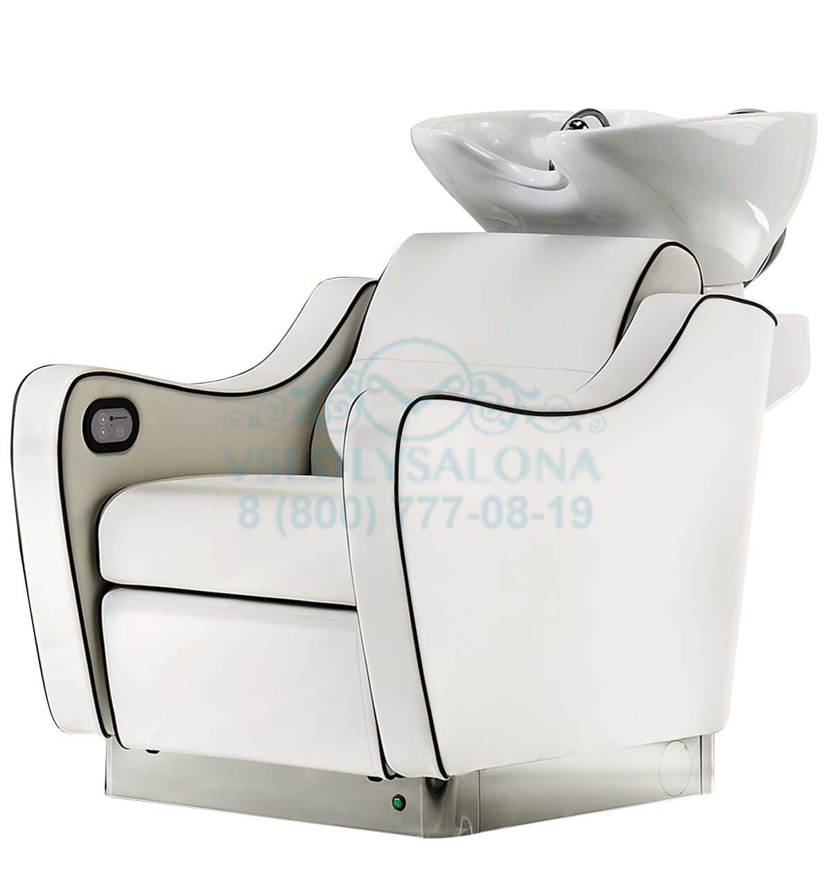 Мойка с креслом, каркас белый или чёрный. Отличается наличием декоративных швов. Комплектуется глубокой керамической раковиной белого или чёрного цвета, с регулировкой угла наклона, комплектом смесителя с хромированной лейкой душа. Мягкие элементы обтянуты искусственной кожей высшего качества, мягкое широкое кресло, возможен вариант с электрической подножкой, легкое управление с помощью пульта, а также с воздушным массажем спины. В наличии цвет: S78 белый рисунок/ швы чёрные. Цена указана на мойку в наличии, с электрической подножкой, белым каркасом и средней раковиной белого цвета.