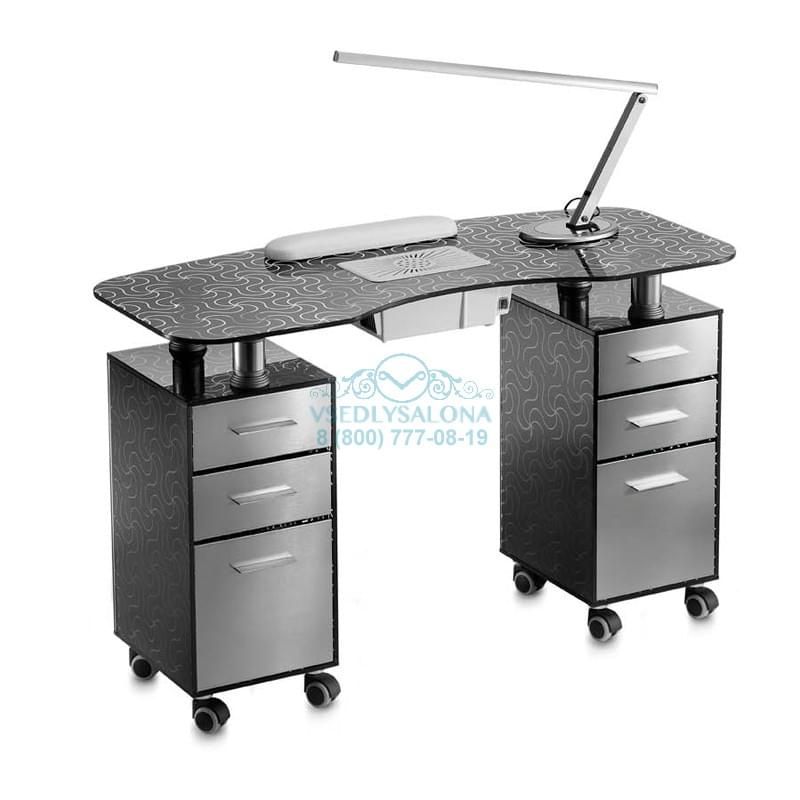 Маникюрный стол с двумя тумбами, столешница из стекла, тумбы из стекла, каждая с тремя выдвижными ящиками из металла, на колесах. В комплекте: лампа, подушка маникюрная, подставка под лаки, вытяжка AR5 Superturbo 80W.