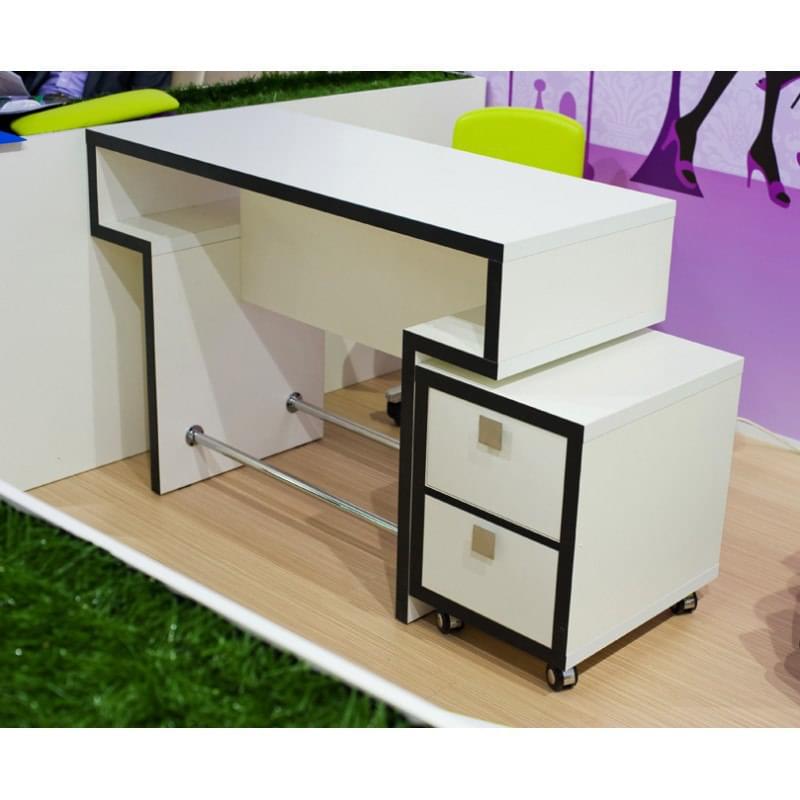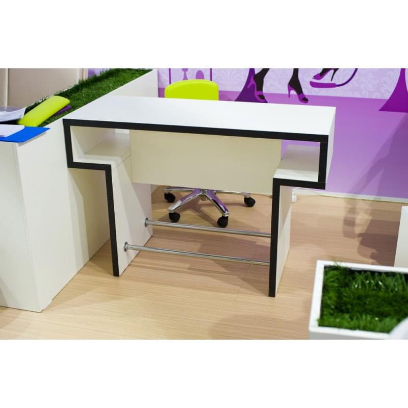 Оригинальный маникюрный стол со столешницей толщиной 40 мм. Выполнен с двумя хромированными штангами для более комфортного расположения ног клиента и мастера. Благодаря необычной форме столешницы, идеально сочетается с тумбой "Квадро". Цветовая гамма может представлять собой любую комбинацию ЛДСП, представленного на сайте. Размеры, см : 120(Ш) x 80(В) x 50(Г)