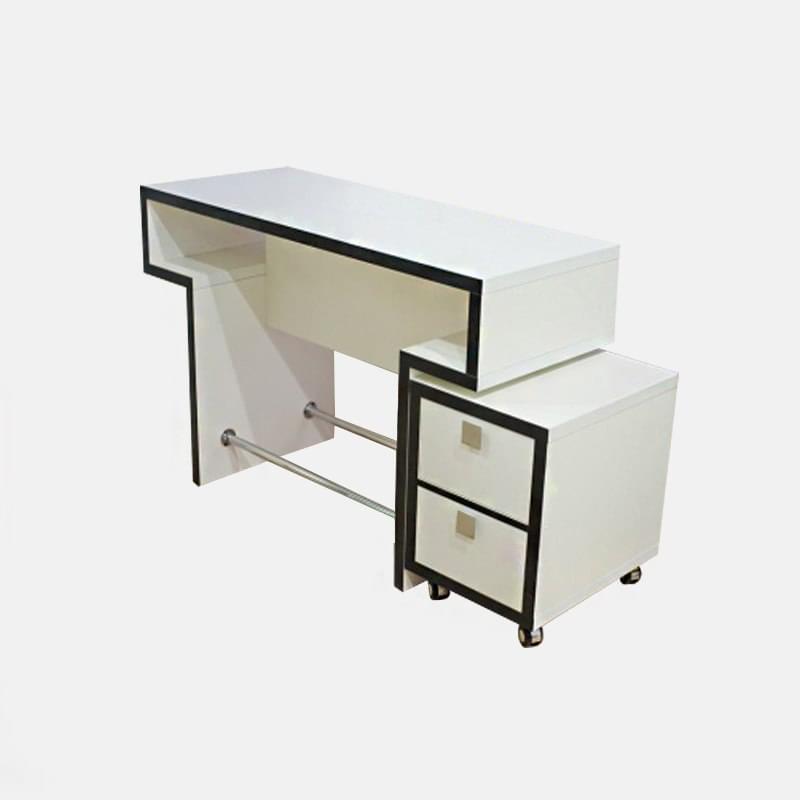 Маникюрный стол «Хирономо» - для тех, кто ищет по-настоящему изысканные решения для своего маникюрного салона или кабинета. Оригинальная форма столешницы, хромированные ножки, вместительная тумба – все это здесь. На нижней полке может быть установлена вытяжка для еще более комфортной работы мастера маникюра.