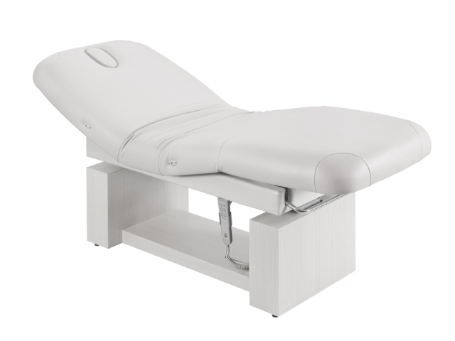 Белый матрас, основание крашеное дерево. Высота, спинка и ножки регулируются электрически, подогрев в зоне поясницы, полка снизу, отверстие для лица,крепление для полотенец как опция, подголовник, подлокотники и подставка для рук в комплект не входят.