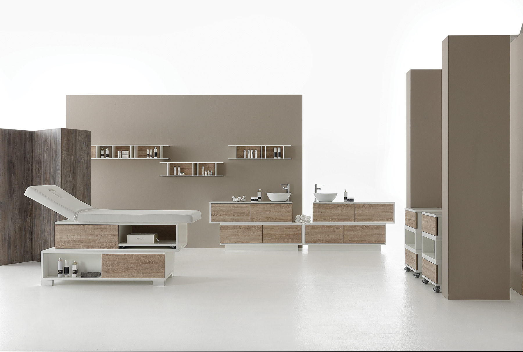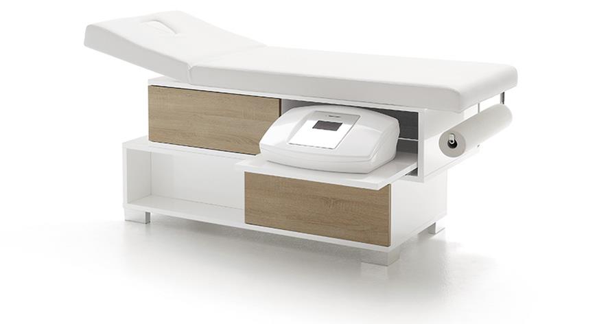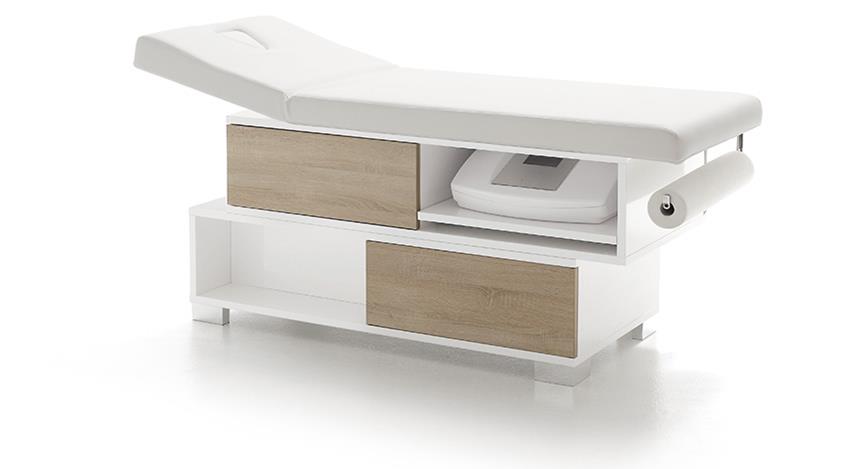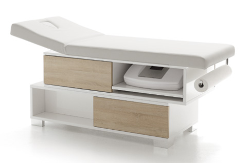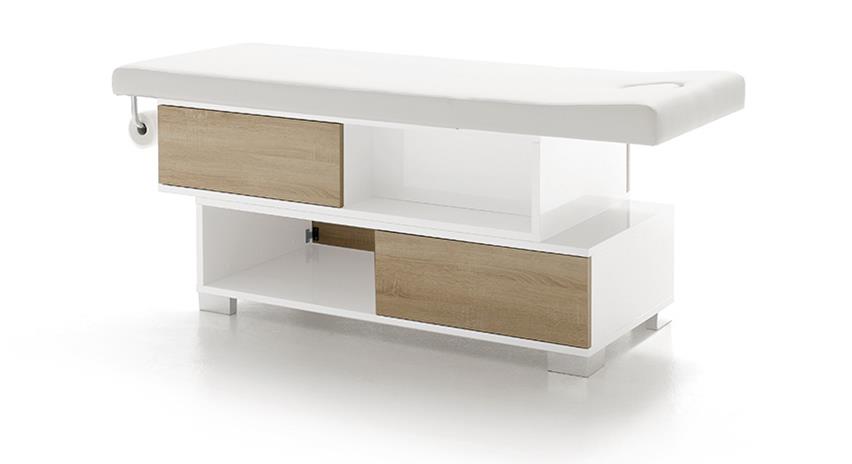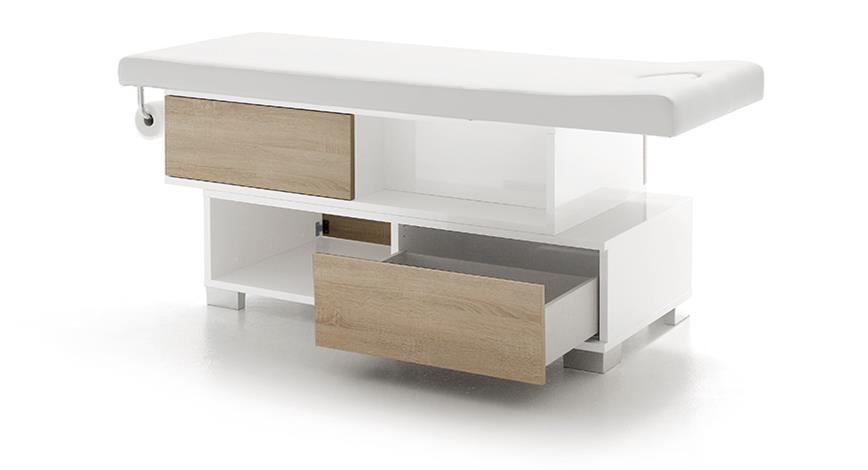 Массажная кушетка «Swing» – функциональная и эргономичная модель, позволяющая рационально использовать пространство. Она оснащена двумя выдвигающимися ящиками и двумя открытыми полками для хранения инструментов и различных средств. Каркас кушетки изготовлен из меламина, ящики – из древесины. Возможно изготовление ящиков в трех вариантах – натуральный венге, белая лиственница, дуб бардолино.