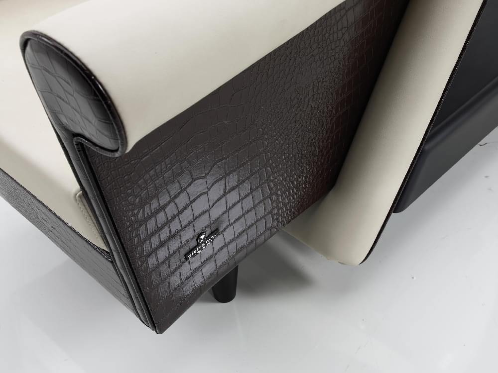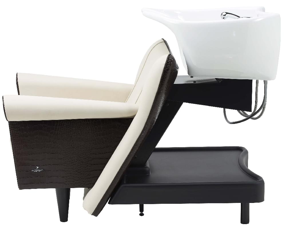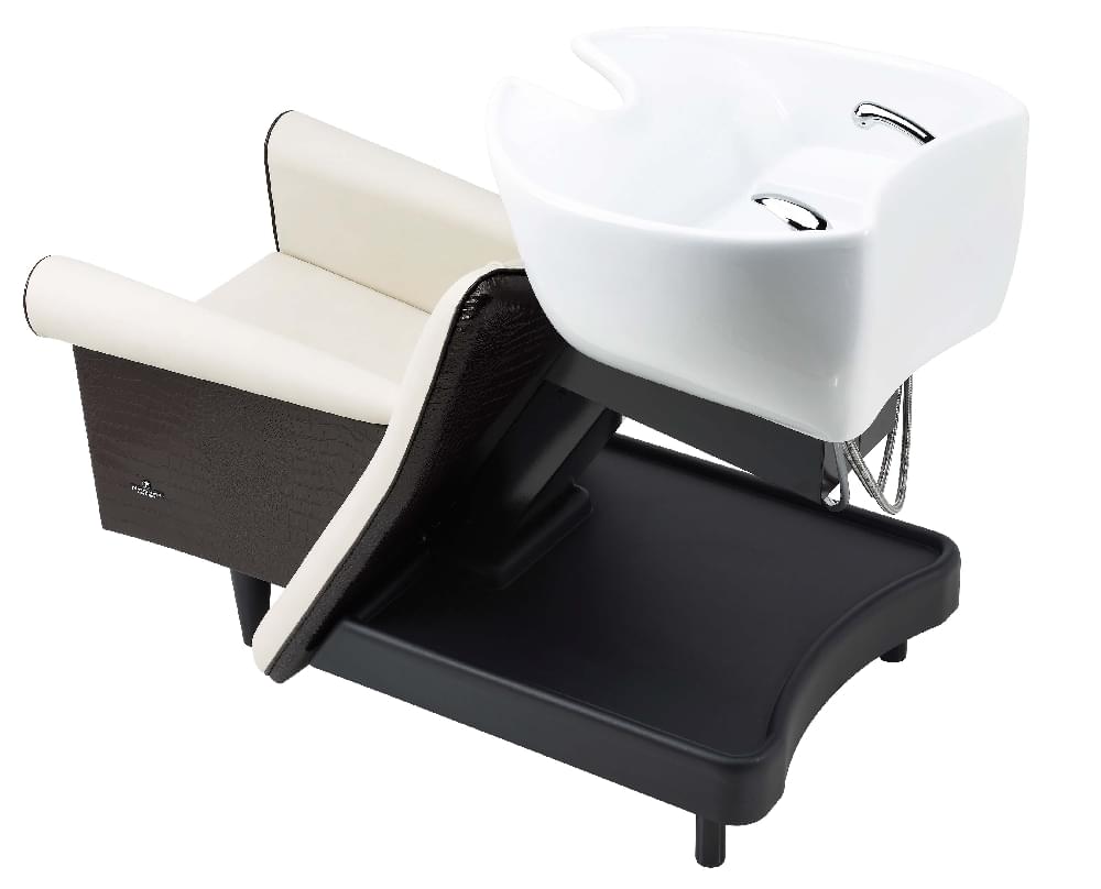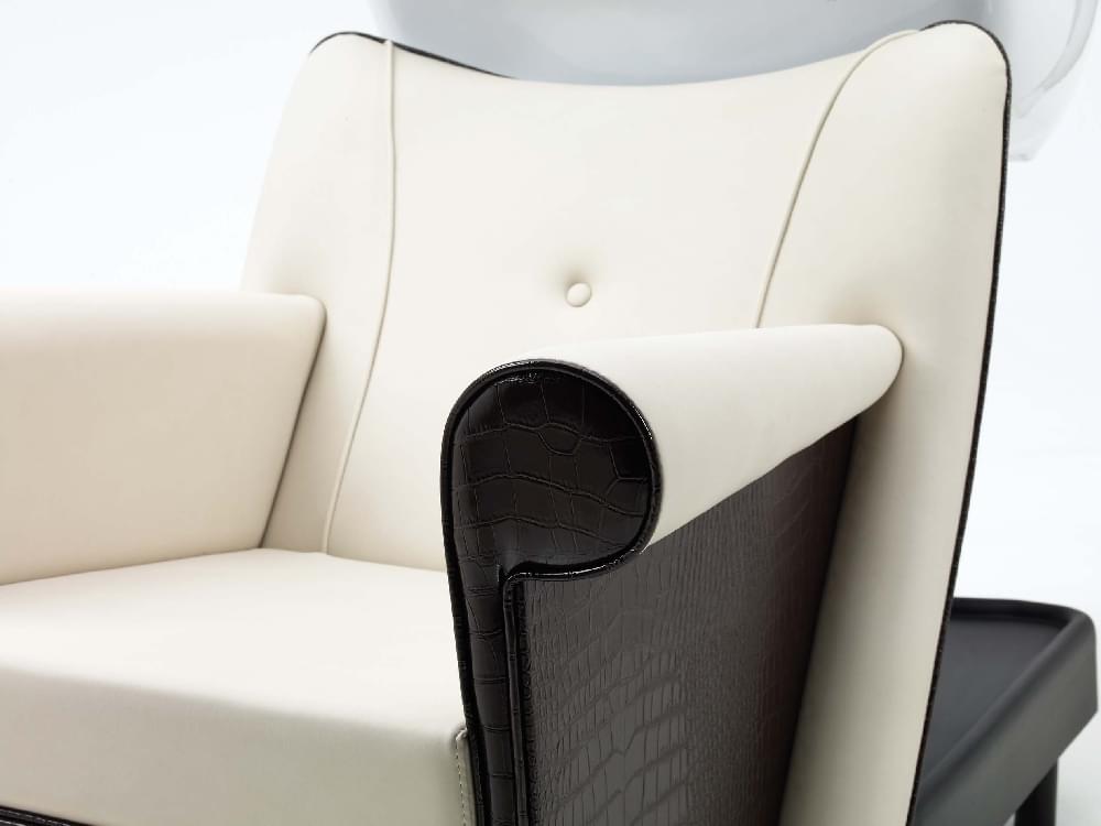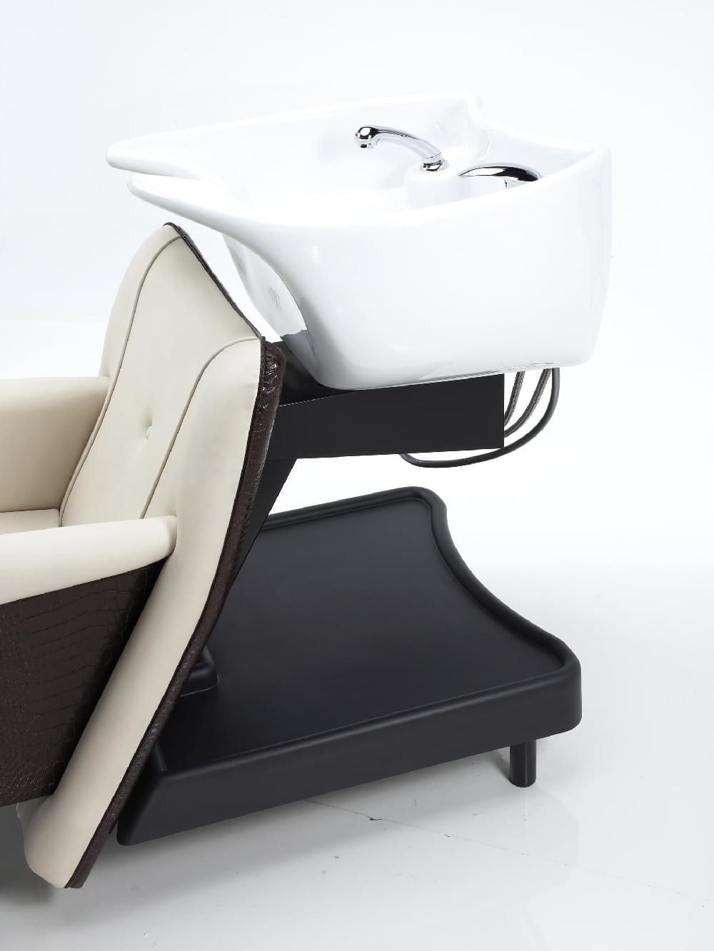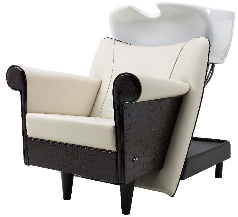 Мойка с креслом на металлическом каркасе черного цвета, сзади пластиковая полка. Комплектуется глубокой керамической раковиной белого или черного цвета, с регулировкой угла наклона, комплектом смесителя с хромированной лейкой душа. Каркас кресла выполнен из металла, мягкие элементы обтянуты искусственной кожей высшего качества, мягкие подлокотники. Размер (ДхШхВ): 120х68х93