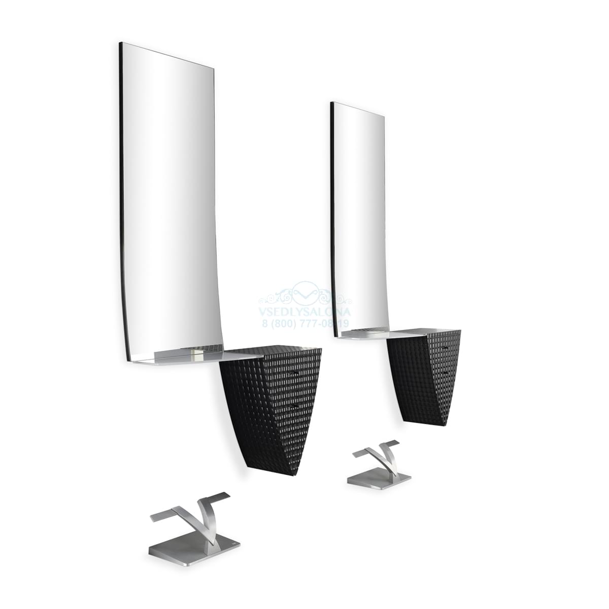 Зеркало парикмахерское выполнено из жемчужного ламината черного цвета с внутренней гравировкой, металлическая подножка, стеклянная полка, выдвижной ящик для инструментов и фена.