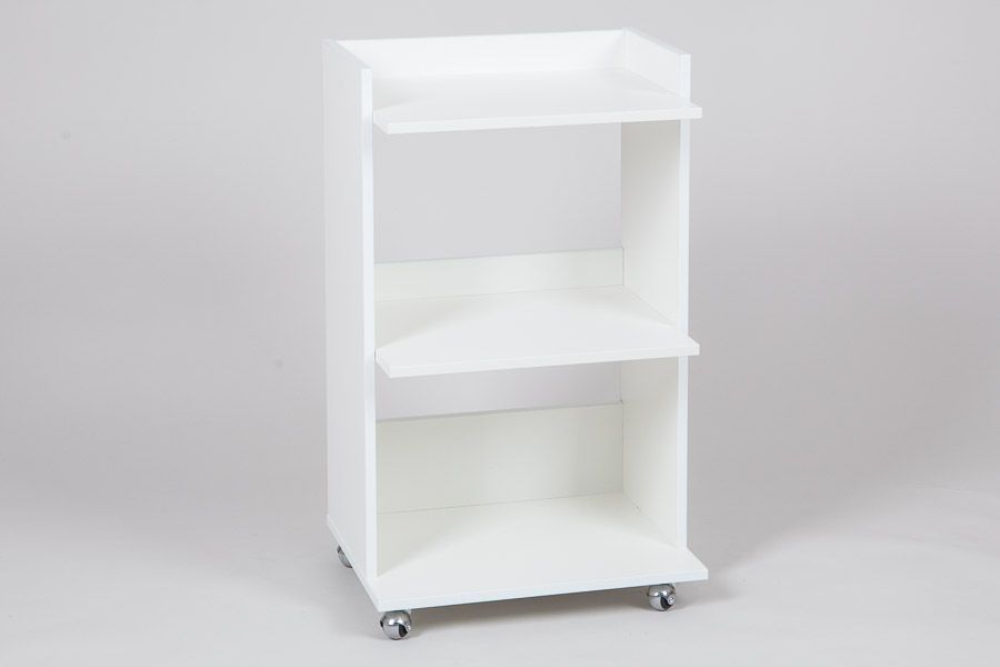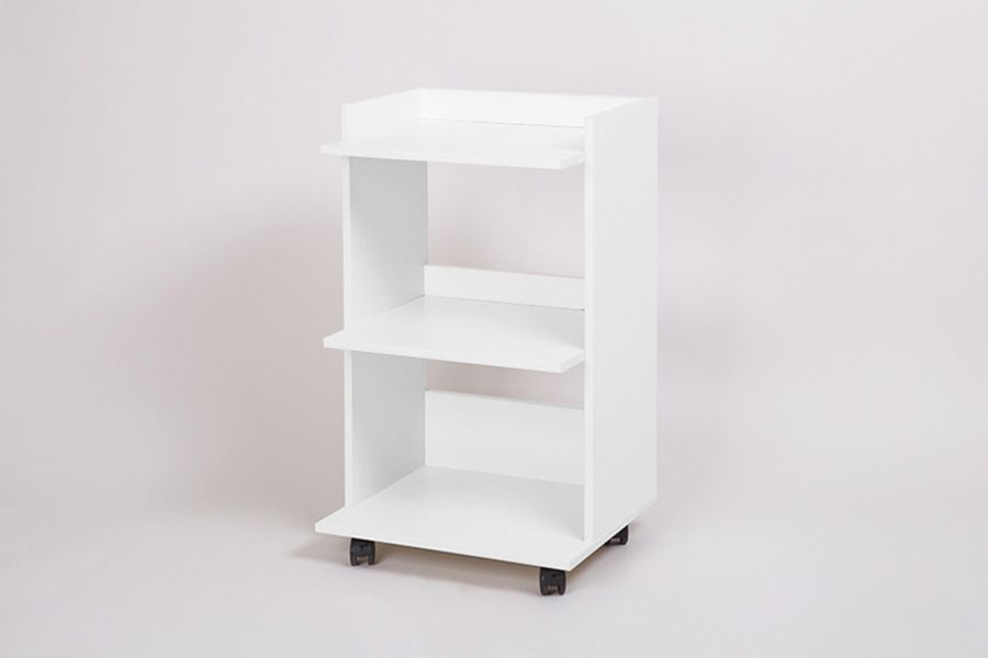 Столик косметолога три полки на колесах. Удобный косметологический столик-тележка с тремя полкапи, ограниченными бортиками с трех сторон. Расстояние между полками 33 см. позволяет ставить высокие флаконы с косметологическими средствами. Влагостойкое ламинированное ДСП порзволяет протирать и обрабатывать столик дез средствами.