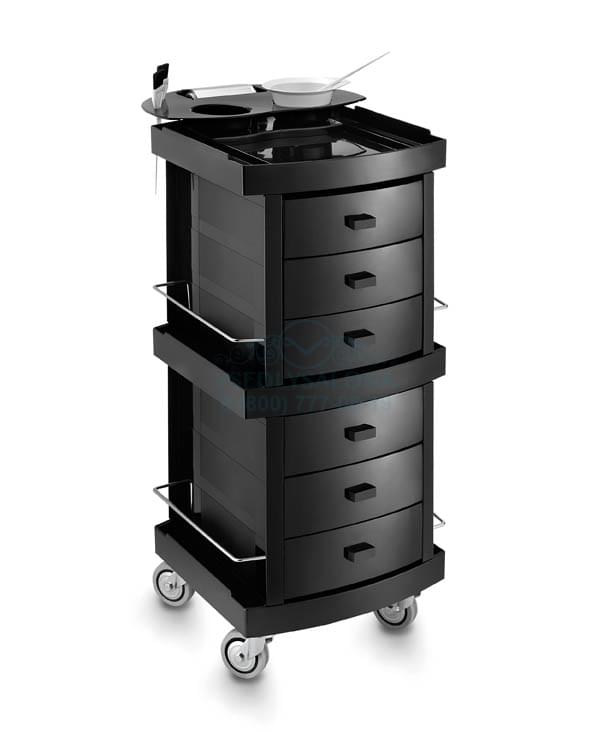 Тележка парикмахерская выполнена из пластика, на колесиках, с выдвижными ящиками. Цвет черный, серый.
