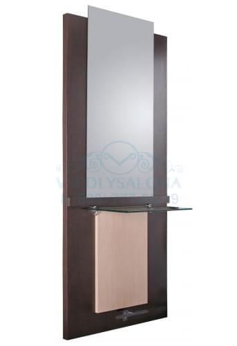 Зеркало парикмахерское, одностороннее, выполнено из ламинированного ДСП с пластиком, столешница стеклянная. Цвет зеркала: венге-беленый дуб, титан-пластик хром волна, другие цвета под заказ. Размер:(ВхГхШ) 188х54х69