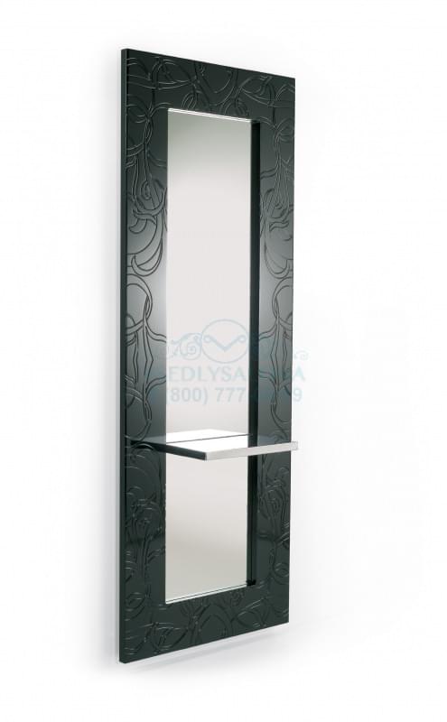 Зеркало парикмахерское, одностороннее, крепление к стене. Металлическая хромированная столешница и подставка под ноги, черная или белая лакированная рама с узором. Размер: 214х80х28